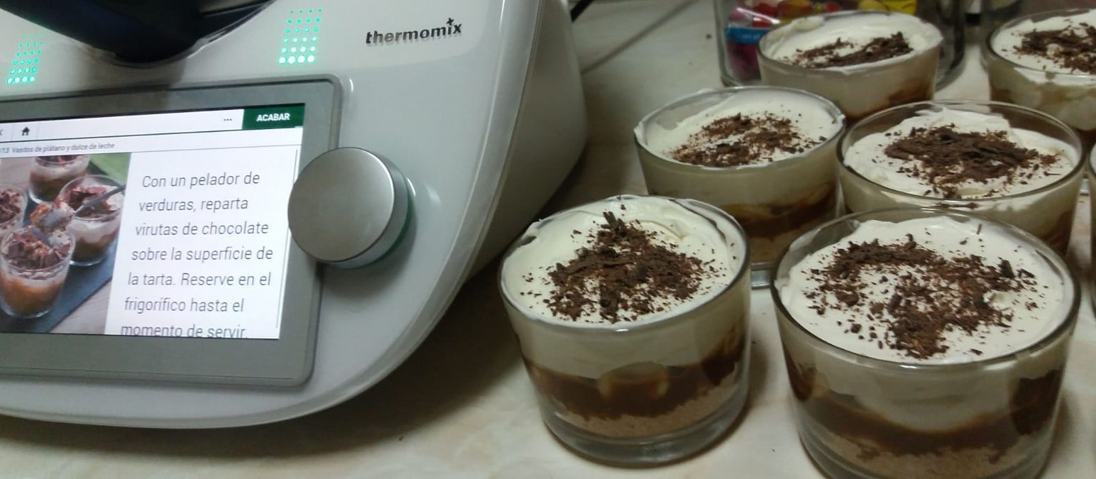 Ponga en el vaso las galletas y la mantequilla y triture 20 seg/vel 7. Reparta la mezcla en 8 vasos bajos, cubra con el dulce de leche y reparta encima las rodajas de plátano.