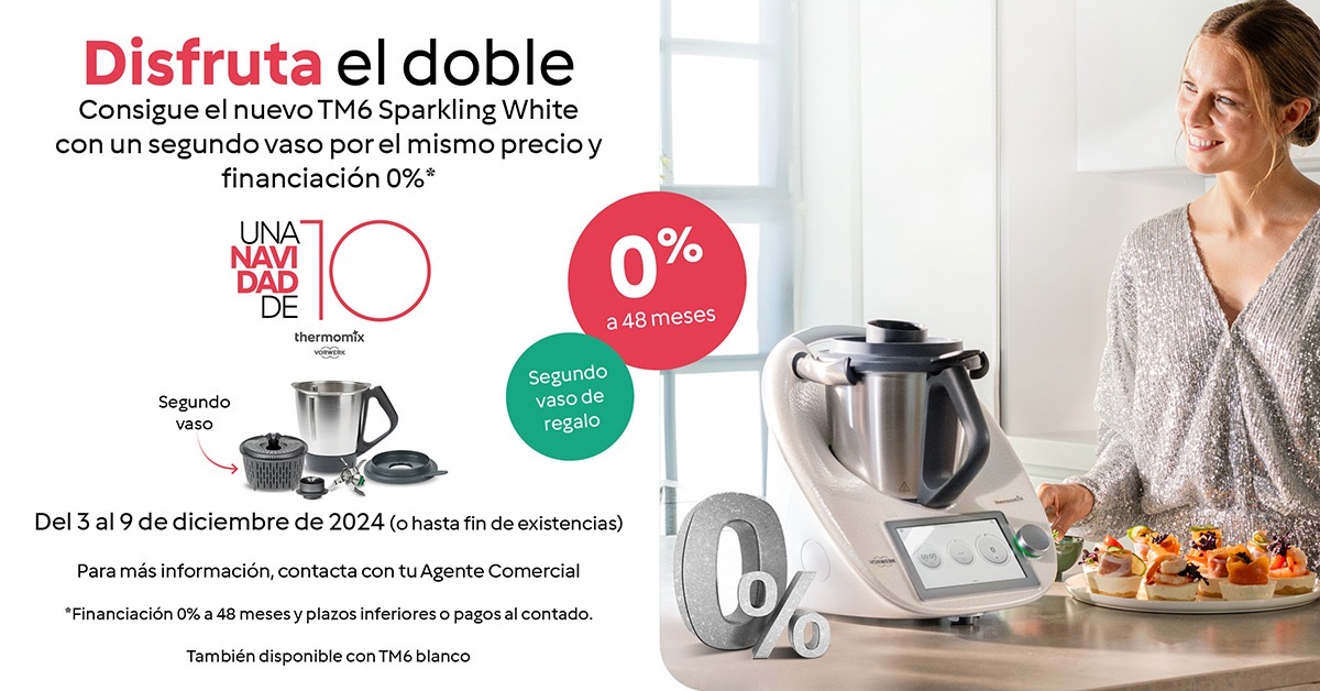 Esta temporada navideña te traemos una oferta irresistible, consigue: Thermomix® TM6 Sparkling White o Thermomix blanco clásico, con un segundo vaso completo totalmente gratis. Además, aprovecha nuestra financiación al 0 % de interés para que tengas tu TM6 con la máxima comodidad.