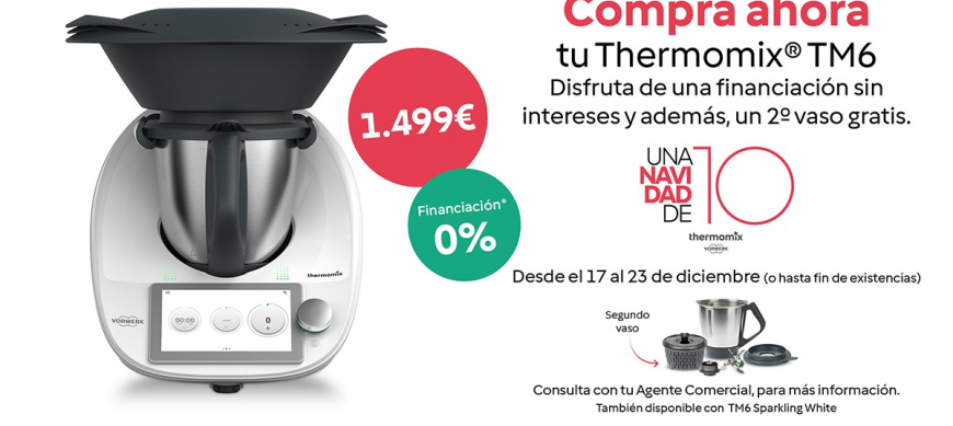 ¡Últimos días! Promoción Thermomix® TM6 Sparkling White o Thermomix blanco clásico, con un segundo vaso completo totalmente gratis. Además, aprovecha nuestra financiación al 0 % de interés para que tengas tu TM6 con la máxima comodidad.