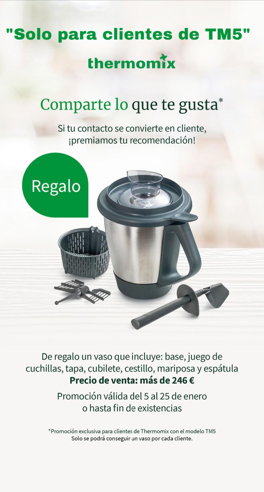 Y si tienes tú Thermomix TM5, también puedes recibir un fantástico regalado de un vaso completo valorado en 246€, por presentarnos un amigo o familiar que se convierta en cliente. ¡Premiamos tú recomendación!