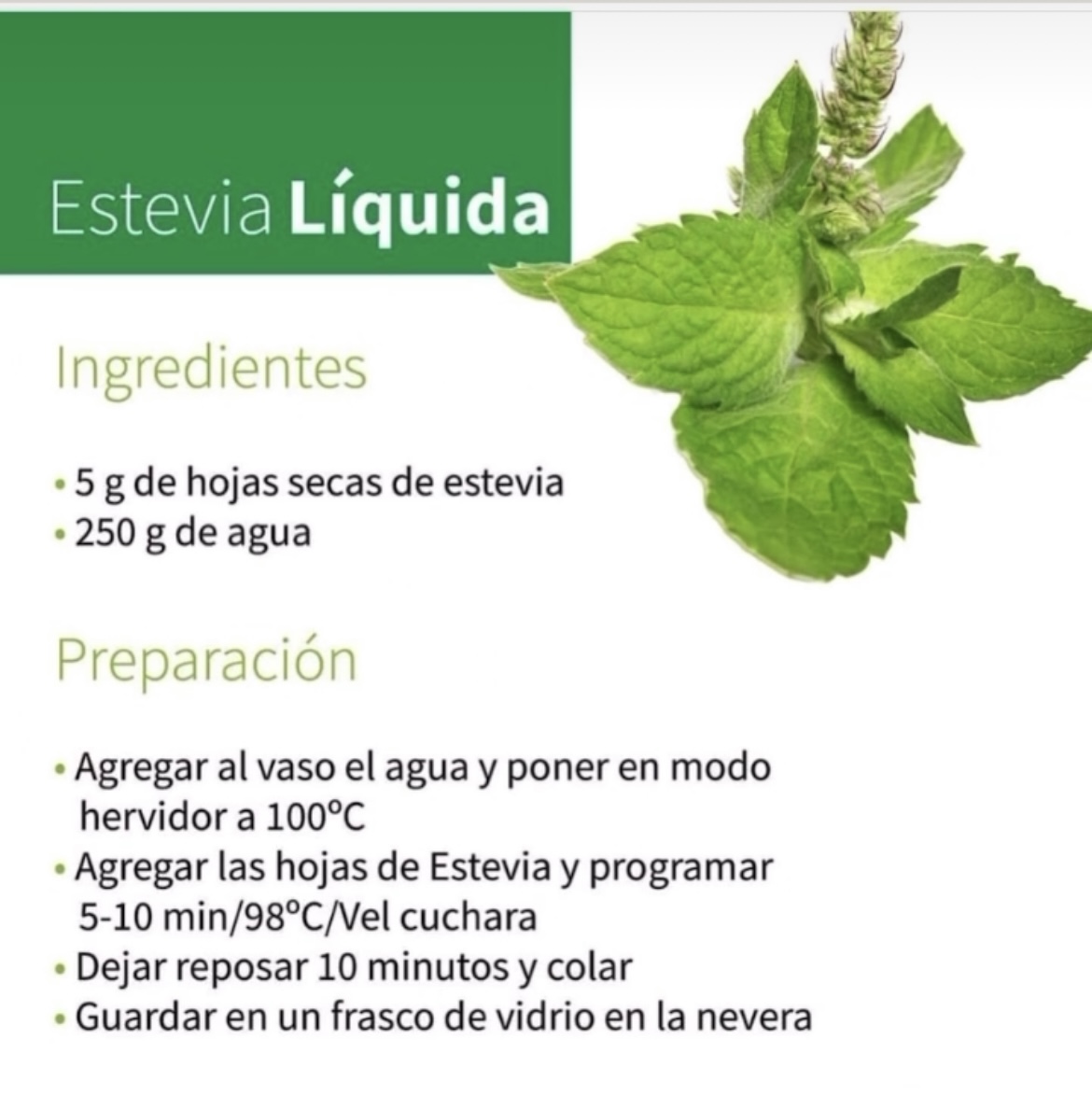 ¡Así es! Hoy te traigo una receta que no puede faltar en casa: “Estevia Líquida”, es un edulcorante natural derivado de las hojas de la planta Stevia rebaudiana.
