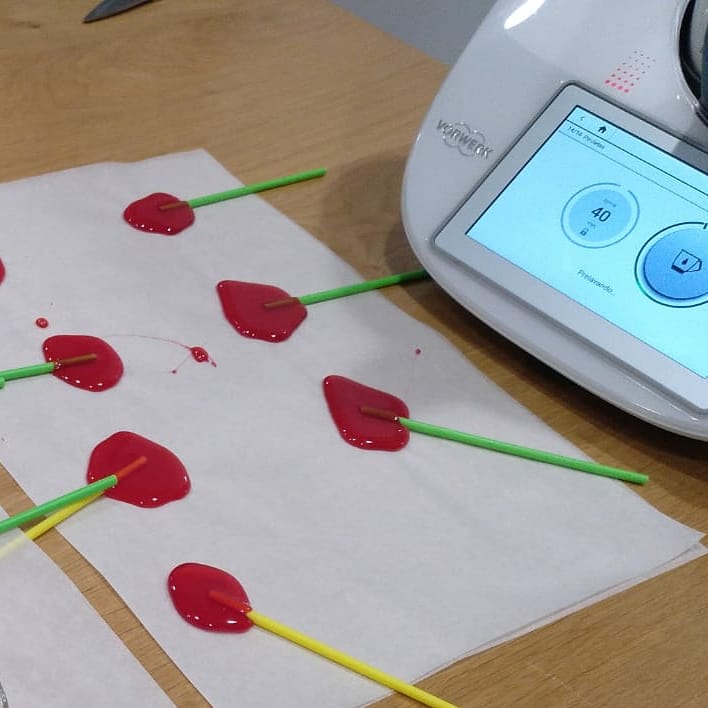 Con una cuchara, forme círculos de caramelo sobre el papel de hornear preparado e inmediatamente, coloque palitos para piruleta presionando y dándoles un pequeño giro para que se cubran de caramelo. Deje enfriar las piruletas completamente (aprox. 10-15 minutos).