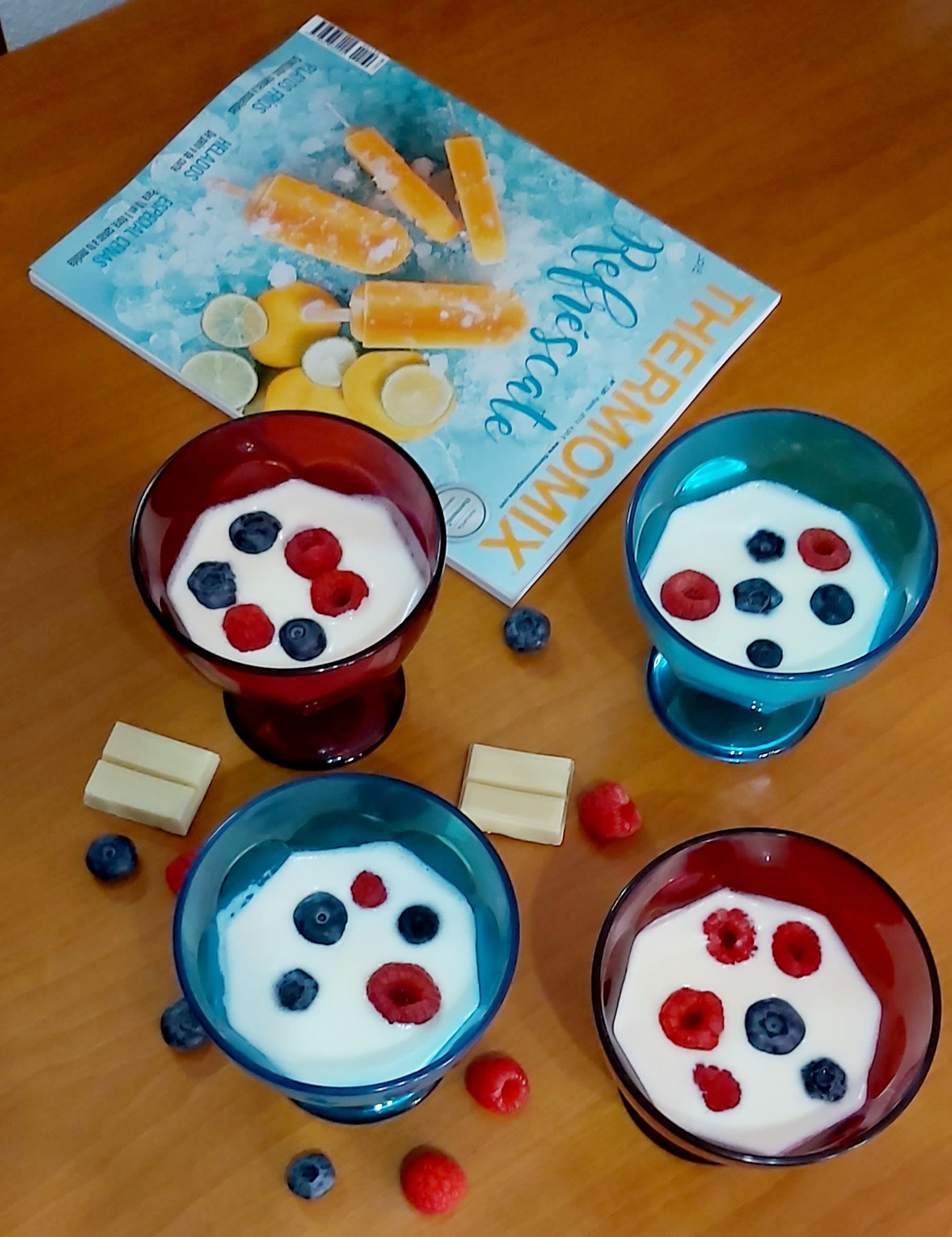 Podéis poner la fruta que más os guste para decorar, pero la verdad es que el contraste del dulce del chocolate blanco con el ácido de los frutos rojos es una auténtica maravilla. Yo suelo hacerlo con frambuesas y arándanos, pero con moras, fresas o grosellas también está increíblemente rico. También podemos rallar un poquito de chocolate negro por encima. Es una de mis recetas Thermomix imprescindible desde que la descubrí.