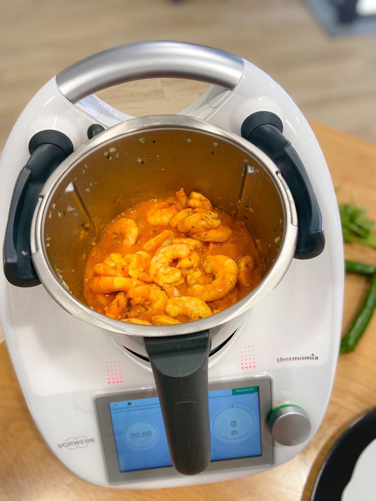 5. Añada al vaso del Thermomix los langostinos y programe 4 min/90°C/giro inerso/vel.cuchara.