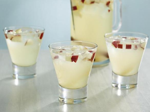 4.- Introduzca el cestillo, sujételo con la espátula y cúele la limonada en la jarra reservada. Añada a la jarra 750 g de vino blanco, la manzana y el hielo. Remueva bien con la espátula y sirva inmediatamente